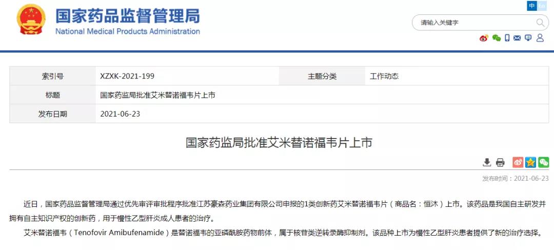 6月23日,國家藥品監督管理局發布公告,由江蘇豪森藥業集團有限公司生產的1類創新藥「艾米替諾福韋片」已批準上市。