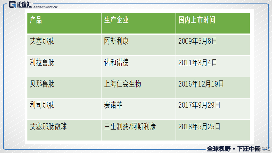 目前國內GLP-1受體激動劑已經獲批上市的有5個,分別為艾塞那肽、艾塞那肽微球、
