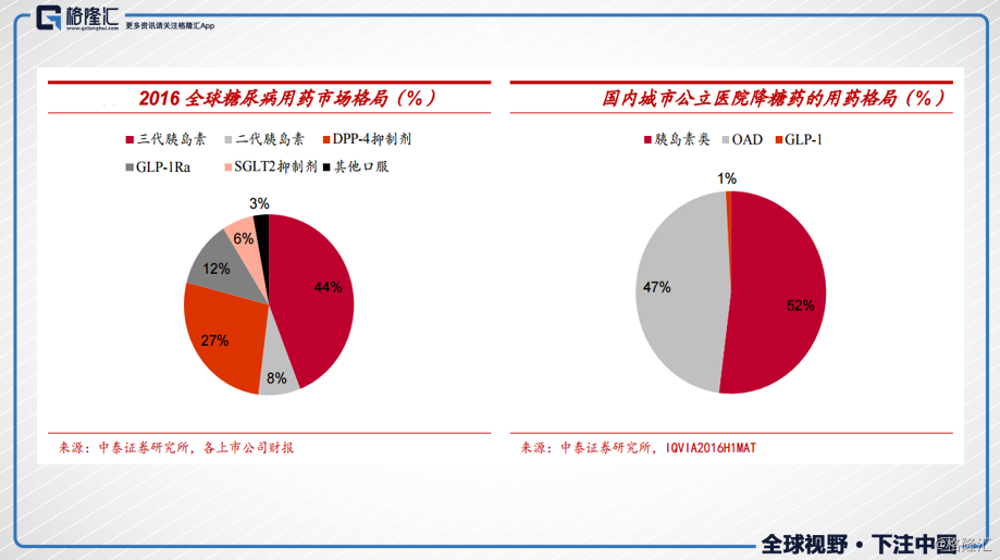 口服降糖藥(OAD)仍為國內公立醫院主流用藥,胰島素占到52%,口服降糖藥(OAD)占到47%,幾乎包攬國內市場,而GLP-1 僅有1%的市場規模,還有很大的提升空間。